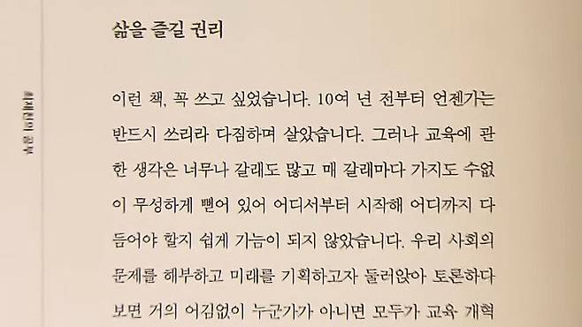 최 교수는 학생들도 삶을 즐길 권리가 있다며 인권 얘기로 책을 시작합니다. 함께 살아가는 사회에 대해 말합니다. 공동체 의식의 중요성을 설파합니다. 아이들에게 삶을 돌려줘야 한다고 강조합니다. 교육의 나아갈 길에 대한 큰 그림을 그려보고자 합니다.