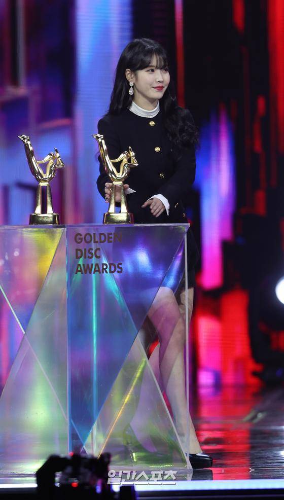 가수 아이유가 8일 오후 서울 구로구 고척스카이돔에서 언택트로 열린 ‘36회 골든디스크 어워즈' 디지털 음원부문 본사을 수상했다.