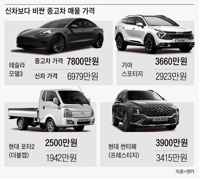 최근엔 새 차보다 가격이 높은 중고차 매물들도 등장하고 있다. 최근 중고차 카페와 거래 사이트엔 현대 캐스퍼가 2150~2250만원에 올라왔다. 이 차의 최상위 모델 가격은 2057만원이다. 신차 가격이 4696만원인 아이오닉5 출고 중고차(2021년식)는 5780만원, 2923만원인 스포티지는 3600만원대 매물이 올라오고 있다. 한 중고차 매매상은 “차량 대기 기간 탓에 웃돈이라도 주고 차를 사겠다는 수요가 생기고 있다”며 “차를 샀다가 임시번호판 단계에서 바로 팔아 차익을 챙기는 경우도 많다”고 말했다.