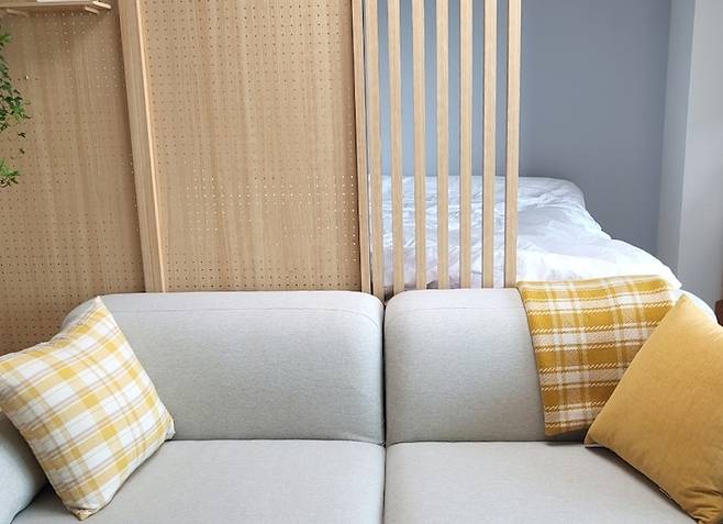 거실장과 침실 사이에는 가벽을 두고 소파가 자리 잡고 있다. 우드 레이 가벽을 두어 공간을 분리해 주었다.
