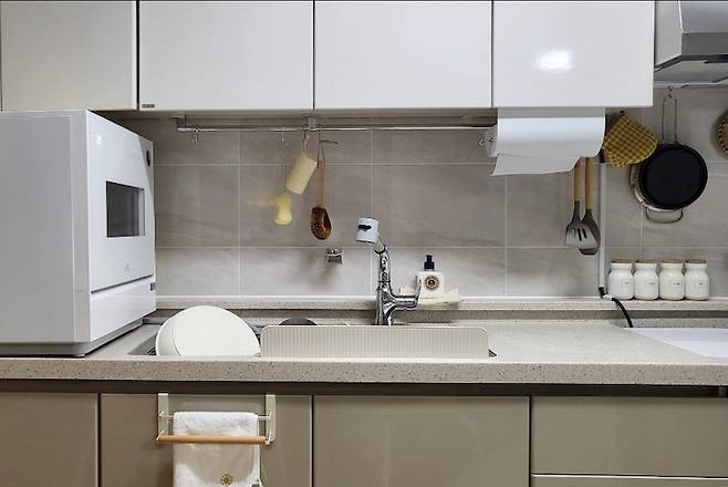 조리 공간 역시 화이트 & 우드 테마에 맞는 주방 용품으로 꾸몄다. 노랑 포인트는 주방 장갑! 밖에 꺼내 둔 수세미 색도 왠지 우리집 인테리어와 톤이 잘 맞는 듯하다.