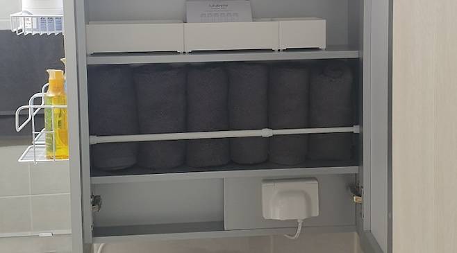 수납공간이 부족해서 거울장 옆, 변기 위에 벽에 주렁주렁 뭘 매달았는데 아주 만족한다. 거울장 안에는 미니 압축봉을 활용해서 수건을 차곡차곡 넣어 수납했다.