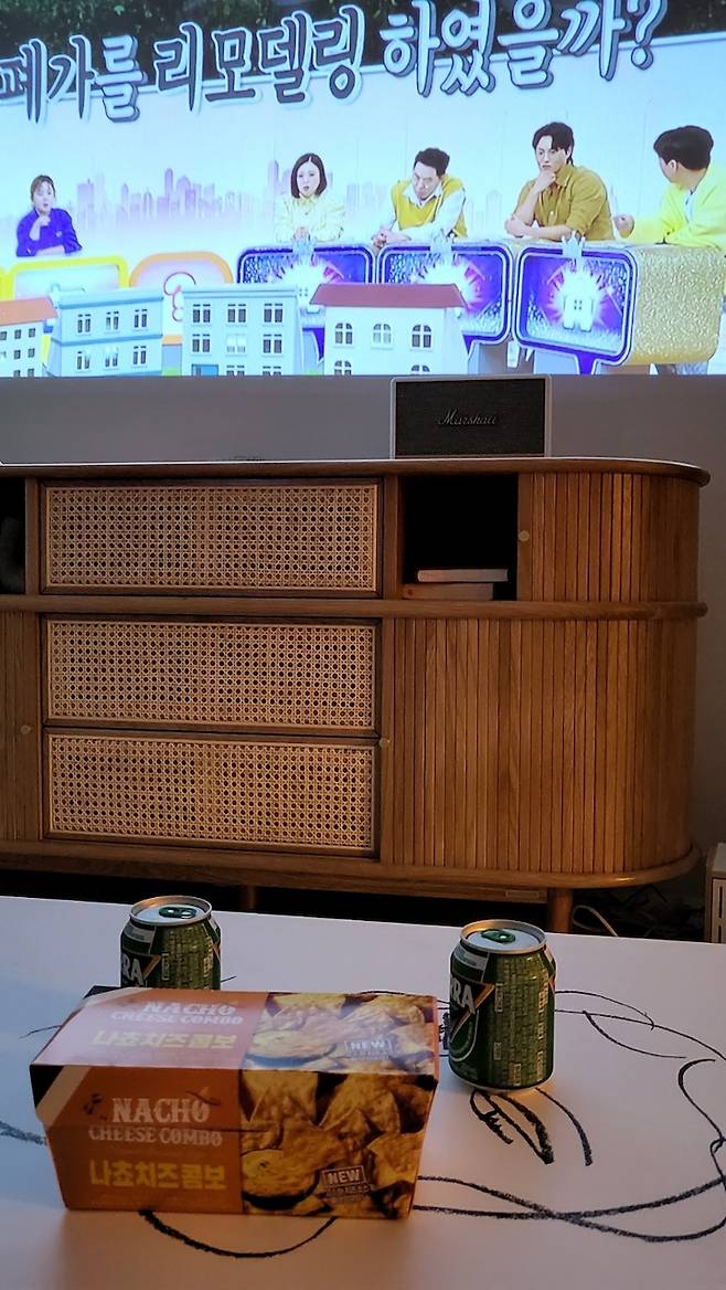 우리는 평일에 TV를 잘 보지 않아 공간을 많이 차지하지 않는 빔 프로젝터를 샀다. 주말 저녁에 가끔씩 미니 캔음료 한잔하면서 영화나 TV 프로그램을 몰아서 시청한다.