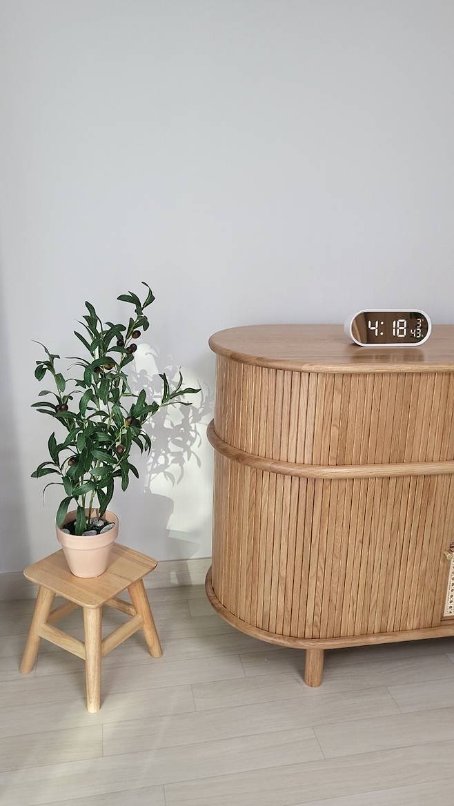 스피커 반대편 공간에는 원목 스툴과 조화 화분을 두었다. 원래 극락조 화분을 두었는데, 에어컨 옆에 두면 죽는대서 부랴부랴 발코니로 옮겼다. 극락조를 빼고 조화를 놓았다.