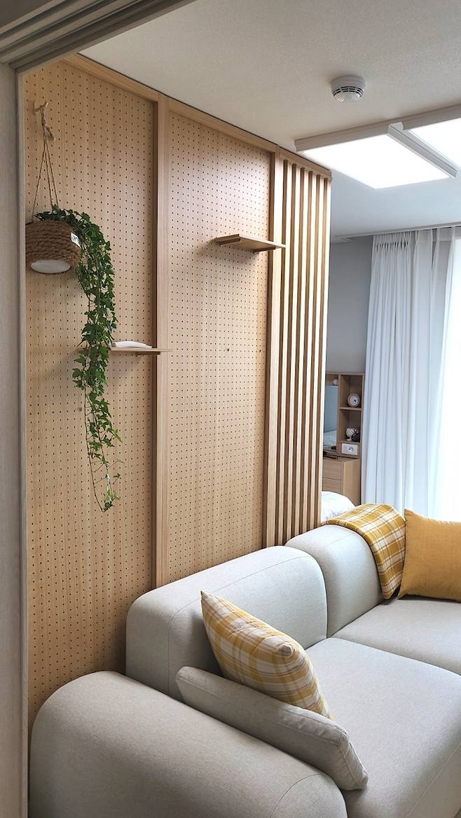 거실장과 침실 사이에는 가벽을 두고 소파가 자리 잡고 있다. 우드 레이 가벽을 두어 공간을 분리해 주었다.