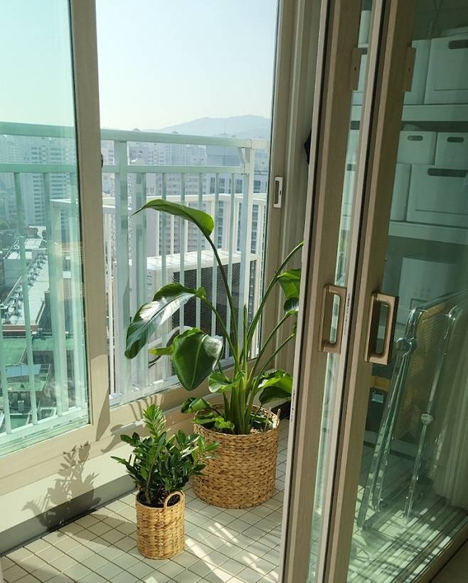 내 힐링 공간 발코니. 오는 손님마다 소파에 앉아 발코니 쪽을 보며 바깥을 구경하다 간다.