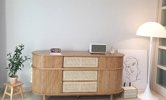 우리는 둘 다 노래 듣는 걸 좋아한다. 음질이 좋다는 스피커 중 예쁜 거실장과 어울리는 제품을 열심히 찾았다. 그렇게 구매하게 된 마샬 스피커. 아주 만족한다. 스피커 옆 비는 공간에는 흰색 스탠드 조명을 두었다.