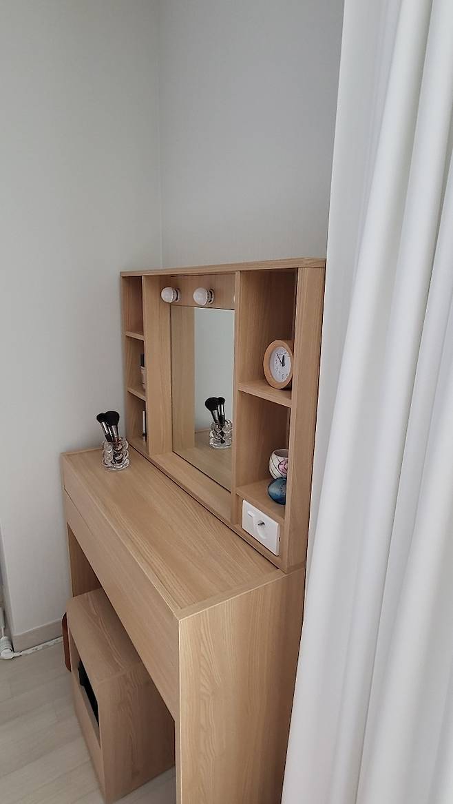 침대 앞에는 우드 톤의 작은 화장대가 자리 잡고 있다.