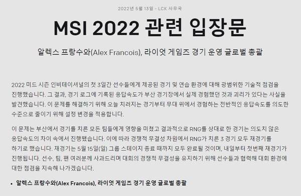 '2022 미드 시즌 인비테이셔널(MSI)'에서 RNG가 치른 세 경기가 모두 무효 처리됐다.