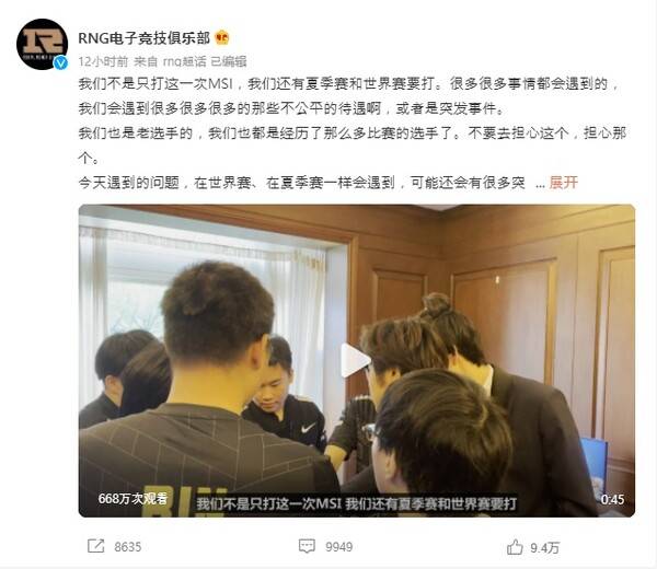 그러나 RNG는 재경기 판결을 받아들이고, MSI에도 계속 참가하겠다는 뜻을 밝혔다. RNG는 라이엇게임즈의 발표 직후 공식 웨이보를 통해 "우리는 이번 대회 뿐만 아니라 여름 시즌과 월드 시리즈도 소화해야 한다. 많은 일들이 벌어질 것이고, 불공평한 대우와 해프닝을 겪을 수도 있을 것"이라며 "우린 수많은 경기를 치른 베테랑이다. 걱정하지 않아도 된다. 오늘 겪은 문제들을 여름 시즌이나 월드시리즈에서도 직면할 수 있다. 당황하지 않고 잘 마무리하겠다"고 전했다.