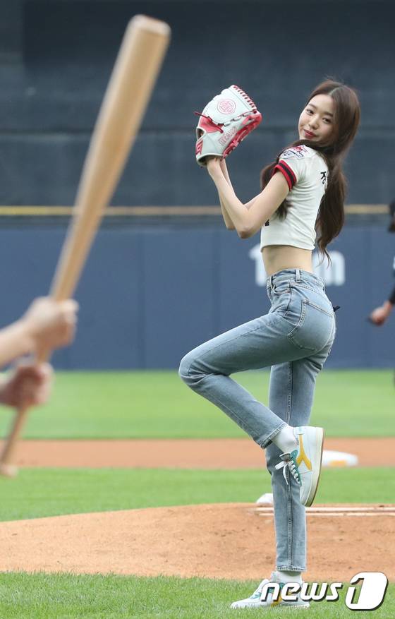 (서울=뉴스1) 송원영 기자 = 걸그룹 '아이브' 장원영이 19일 서울 송파구 잠실야구장에서 열린 프로야구 '2022 신한은행 SOL KBO리그' kt위즈와 두산베어스의 경기에서 시구를 하고 있다. 2022.6.19/뉴스1