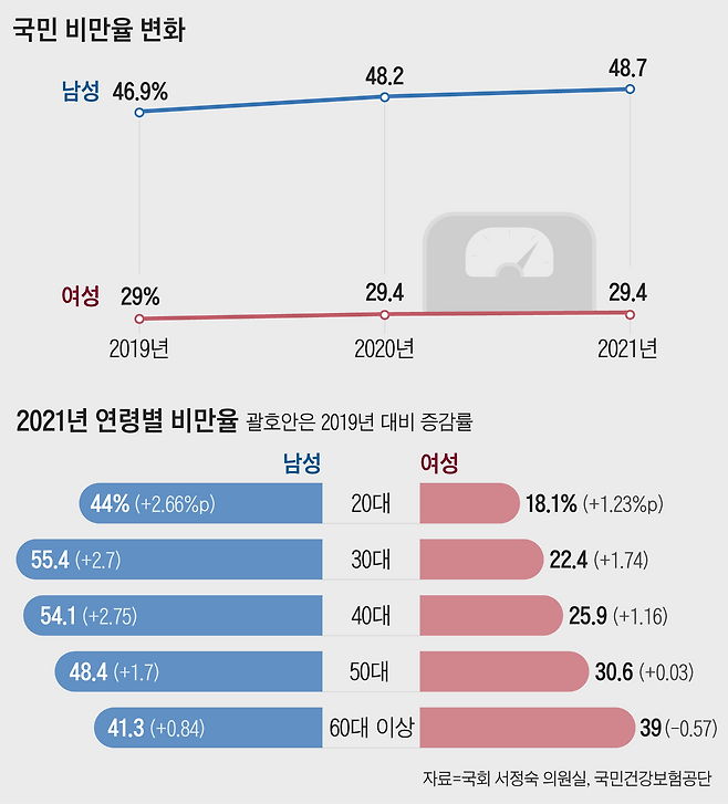 지난해 30대 남성의 비만율이 55.4%를 기록해 역대 처음으로 55%를 넘긴 것으로 나타났다. 40대 남성의 비만율도 54.1%로 55%에 근접했다. 코로나 여파로 활동량이 줄고, 식습관이 나빠졌기 때문으로 풀이된다.