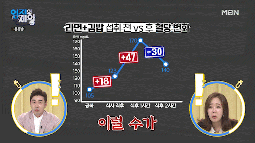 라면과 김밥을 동시에 섭취했을 때 혈당 변화는 이전의 혈당 수치와 다릅니다..!
