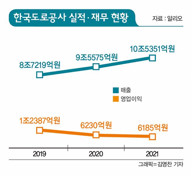 [편집자주]윤석열 대통령이 특별 지시한 '공공기관 구조조정'이 본격화되며 관가 안팎의 긴장감이 고조되고 있다. 국토교통부 산하 한국도로공사는 3년 연속 경영평가에서 종합 '우수(A)등급'을 받았지만 올 초 내부 직원의 뇌물 수수 등 향응 사실이 드러나 도덕적 해이 논란이 일고 있다. 2020년 신종 코로나바이러스 감염증(코로나19) 사태 이후 자차 이용 확산에 따른 통행료 수입 증가, 정부의 인프라 투자로 홀로 매출 성장을 이루며 고액 성과급 파티를 벌인 도로공사는 2020~2021년 경영실적 A와 윤리경영 D를 받았다. 도로공사 매출에 기여하는 휴게소, 청년창업 매장 등과는 상생을 외면했다는 비판이 수년째 이어진 가운데 퇴직자 단체가 세운 계열사는 적자에도 수십억원을 배당해 올해도 국감에서 재조명될 것으로 보인다.