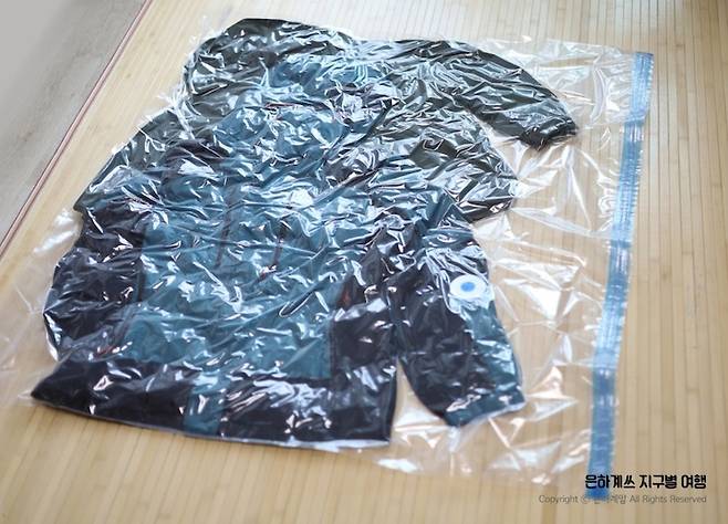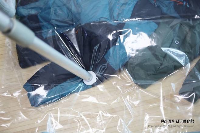 진공청소기를 이용해서 공기를 빨아들입니다. 이렇게 압축팩을 이용하면 부피가 80%이상 줄어들어서 공간을 효율적으로 사용할 수 있죠.