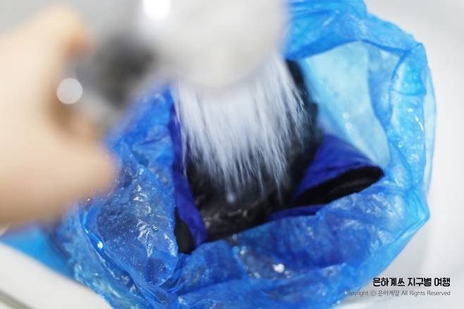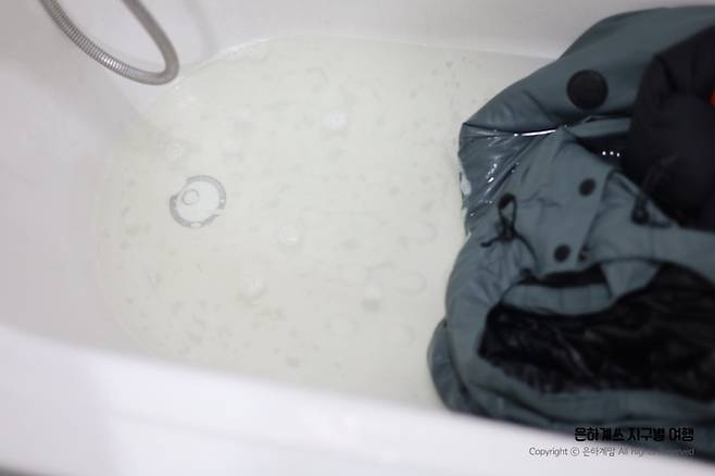 2) 샤워기를 틀어서 물을 점퍼가 잠길 만큼 채워줍니다.