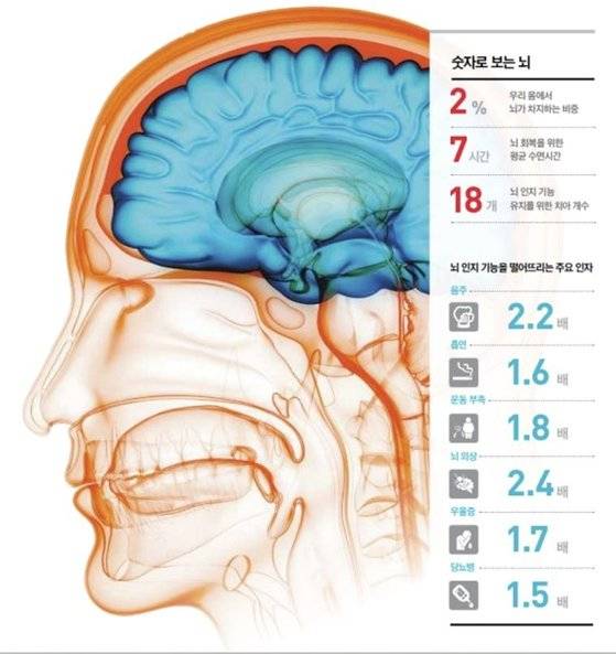 수퍼 브레인 만들기 고작 1.4㎏에 불과한 뇌는 전신을 지배한다. 하지만 노화·외상 등으로 한 번 손상되면 보고, 듣고, 말하고, 기억하고, 판단하는 등 뇌의 인지 기능이 떨어진다. 독립적인 일상생활이 어려워지는 등 치명적인 후유증이 남는다. 현재 의학 수준으로는 이렇게 손상된 뇌를 근본적으로 치료하지 못한다. 평소 생활습관을 바꾸면 뇌 인지 기능이 약해지는 것을 차단하는 수퍼 브레인으로 뇌 건강을 지킬 수 있다. 3월 셋째 주 ‘세계 뇌 주간(World Brain Awareness Week)’을 계기로 뇌 건강을 위한 습관을 알아보고 치매·뇌졸중·파킨슨병 등 뇌 질환에 적극적으로 대처하자.