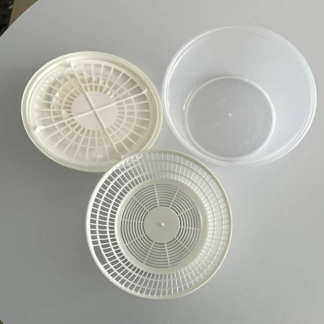 이렇게 분리되는데 저기다 채소 넣고 수동으로 돌돌 돌리면 밑으로 물이 빠지는 구조.