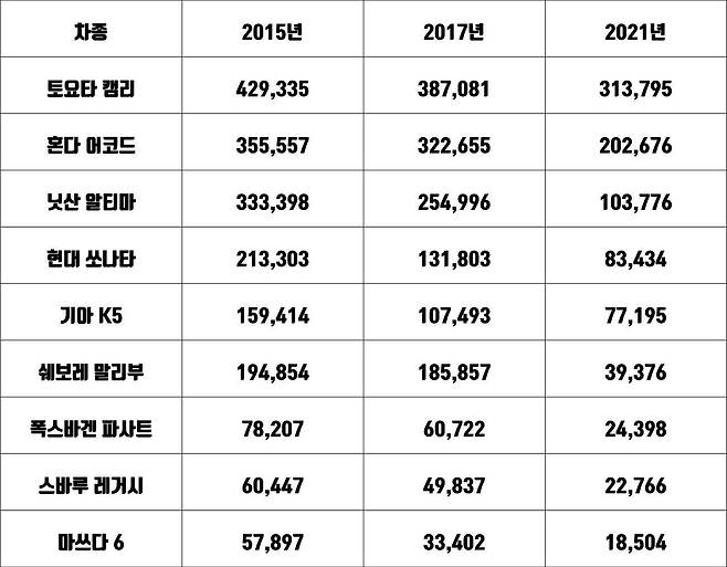<미국 내 중형 세단 판매량 추이 / 2015~2021년>