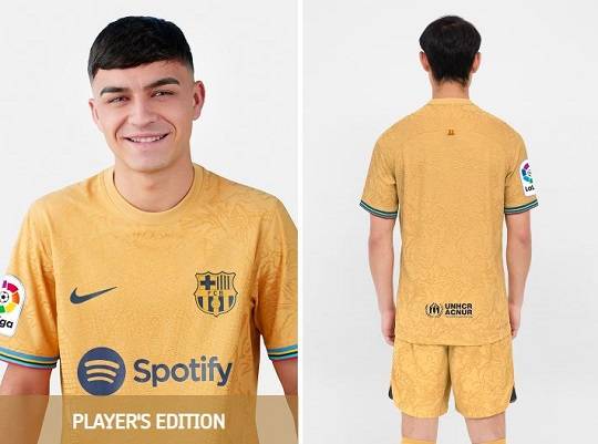 바르셀로나는 27일(한국시간) “2022-23시즌에 바르셀로나 선수들이 입을 원정 유니폼을 공개한다. 이번 유니폼은 상의와 하의, 양말까지 골드 색상으로 디자인했다”는 소식을 알렸다. 새 원정 유니폼 메인 모델로 페드리와 안수 파티가 등장했다.