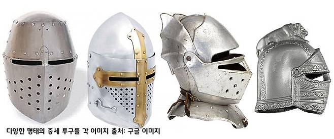 서양의 중세 투구 중에는 주조 공법으로 만들어져서 정말로 무겁고 두툼한 것이 있기도 하지만, 1~2mm 두께의 철로 만들어진 것들도 있다. 물론 얇은 두께의 것들도 얼굴 전체를 덮는 풀 페이스 타입(full face type)은 상당히 무겁다. 그런 투구와 온 몸 전체를 무거운 갑옷으로 감싸고 긴 칼과 크고 두터운 방패를 들고 싸운다는 건 정말로 엄청난 체력이 요구된다. 그래서 저런 갑옷의 이미지가 상장하는 바가 용맹과 카리스마인지도 모른다.