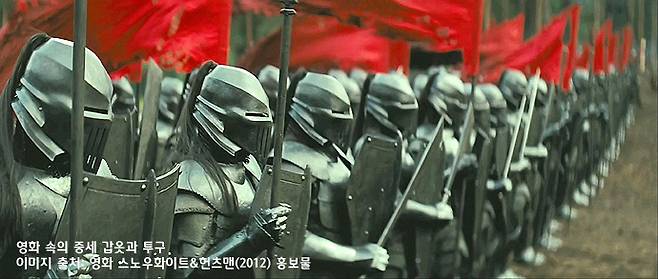 서양의 중세 투구 중에는 주조 공법으로 만들어져서 정말로 무겁고 두툼한 것이 있기도 하지만, 1~2mm 두께의 철로 만들어진 것들도 있다. 물론 얇은 두께의 것들도 얼굴 전체를 덮는 풀 페이스 타입(full face type)은 상당히 무겁다. 그런 투구와 온 몸 전체를 무거운 갑옷으로 감싸고 긴 칼과 크고 두터운 방패를 들고 싸운다는 건 정말로 엄청난 체력이 요구된다. 그래서 저런 갑옷의 이미지가 상장하는 바가 용맹과 카리스마인지도 모른다.
