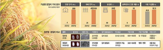 정부가 저렴한 비용으로 기존 밀가루를 대체할 수 있는 ‘분질미’(粉質米)를 2027년까지 연간 밀가루 수요(약 200만t)의 10% 수준까지 대체한다는 계획이다. 분질미를 이용한 쌀 가공시장 규모도 10조 원 규모로 확대한다.