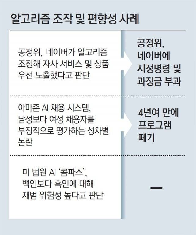 실제 알고리즘을 조작하거나, 알고리즘 자체에 편향성이 녹아든 사례도 있다. 2020년 공정위는 네이버가 쇼핑, 동영상 검색 알고리즘을 임의로 조정해 자사 상품과 서비스를 우선 노출했다고 판단하고 네이버에 시정명령과 함께 과징금 267억 원을 부과했다. 세계적으로도 ‘알고리즘의 편견’ 사례를 찾기는 어렵지 않다. 2014년 아마존은 과거 10여 년간의 자료를 바탕으로 이력서를 검토하는 AI 채용 시스템을 개발했는데, 기존 데이터에 남성 합격자가 더 많았던 터라 시스템은 여성 채용자를 부정적으로 평가했다. 결국 이 시스템은 4년 뒤인 2018년 폐기됐다. 2016년에는 미국 일부 주 법원에서 피고의 재범 가능성을 계산해 구속 여부를 추천하는 데 이용되는 AI ‘콤파스’가 흑인의 재범 가능성을 백인보다 높게 평가하기도 했다.