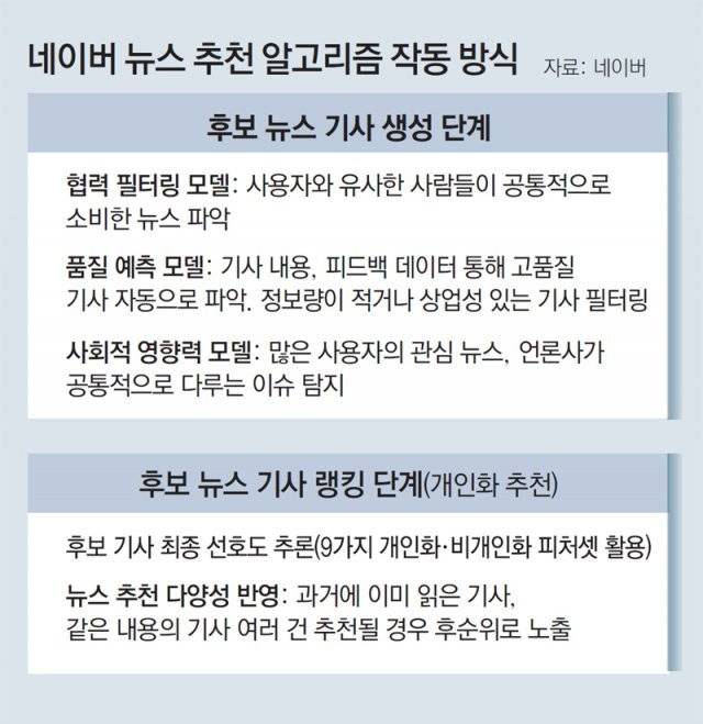 네이버와 카카오 측은 인간의 인위적인 개입이 불가능한 구조라고 설명한다. 네이버와 카카오는 AI 기반의 콘텐츠 추천 시스템을 뉴스 추천과 편집에 이용하고 있다. 기계학습과 딥러닝 기반의 기술을 통해 개인의 뉴스 소비 패턴을 학습하고, 이용자가 관심을 가질 만한 뉴스를 자동으로 예측해 추천하는 것이다. 네이버 에어스 알고리즘은 기사의 콘텐츠 특성과 사용자의 클릭 수, 체류 시간 등 사용자의 피드백을 고려하는 QE(Quality Estimation) 모델로 품질을 예측한다. 카카오도 콘텐츠가 얼마나 사용자의 클릭을 유도했는지에 대한 ‘클릭률’뿐만 아니라 본문에서의 체류 시간을 나타내는 ‘열독률’을 고려해 뉴스를 추천한다.