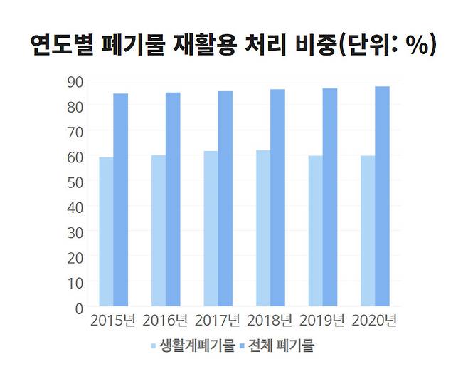 우울한 통계가 가득할 것으로 예상했지만, 적어도 재활용 통계만큼은 박수를 보낼 만하다. 2020년 발생한 폐기물 중 재활용된 쓰레기의 비중은 87.3%에 달했다. 매립과 소각의 비중은 고작 5%대다. 분리배출 과정이 체계적으로 관리되는 건설 폐기물과 사업장 폐기물을 제외하고, 일반 가정이나 소규모 사업장에서 배출된 생활계 폐기물만 따졌을 때에도 재활용률은 59.8% 수준이다. 산처럼 쌓인 배달 플라스틱 쓰레기를 보며 죄책감을 느꼈는데, 굳이 그럴 필요 없었던 것 같기도 하다.