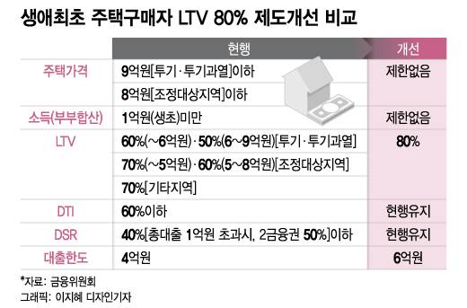 바뀐 제도에서는 주택 소재지역과 주택가격과 상관없이 생애최초 구매자는 LTV 상한선이 80%로 통일된다. 생애최초 대출 신청에 걸림돌로 꼽혔던 소득기준도 사라진다. 집값 상승을 반영해 총 대출한도는 4억원에서 6억원으로 확대한다. 주택금융공사의 정책모기지에도 생애최초 구매자는 LTV 80%(현재 55~70%)가 적용된다.