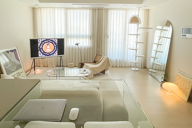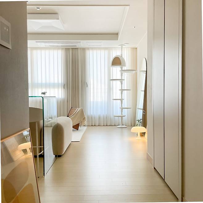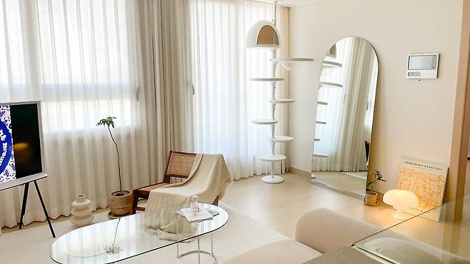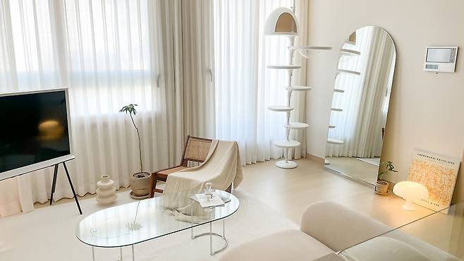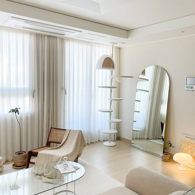거실의 남는 공간에는 큰 전신 거울과 캣타워를 두었습니다. 캣타워는 전체적인 공간의 톤을 해치지 않는 깔끔한 톤에 미니멀한 쉐입으로 골랐습니다.