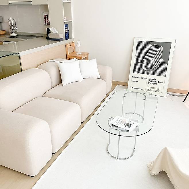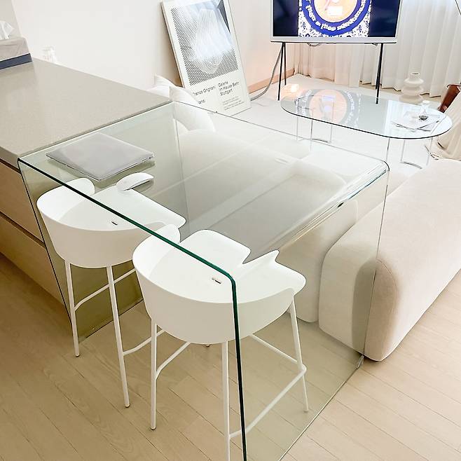 그다음으로는 '투명한 재질'을 활용했습니다. 저희 집의 경우엔 TV 정면으로 소파와 식탁을 두어야 했는데, 거실이 좁아 기존의 식탁을 두면 사이즈도 안 맞고 답답해 보일 것 같더라고요. 그래서 선택한 방법이 아일랜드 식탁 옆으로 투명한 테이블을 두는 거였습니다. 보시다시피 덕분에 좀 더 개방감이 느껴지는 거실이 되었습니다. 집의 시그니처도 생겼고요!