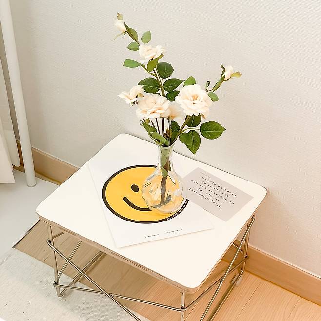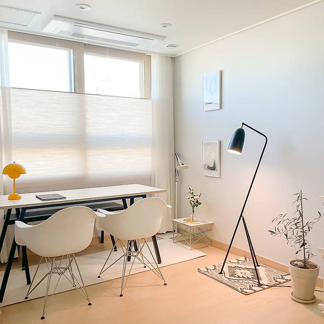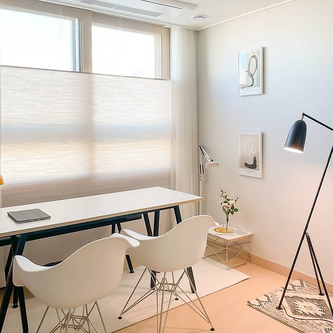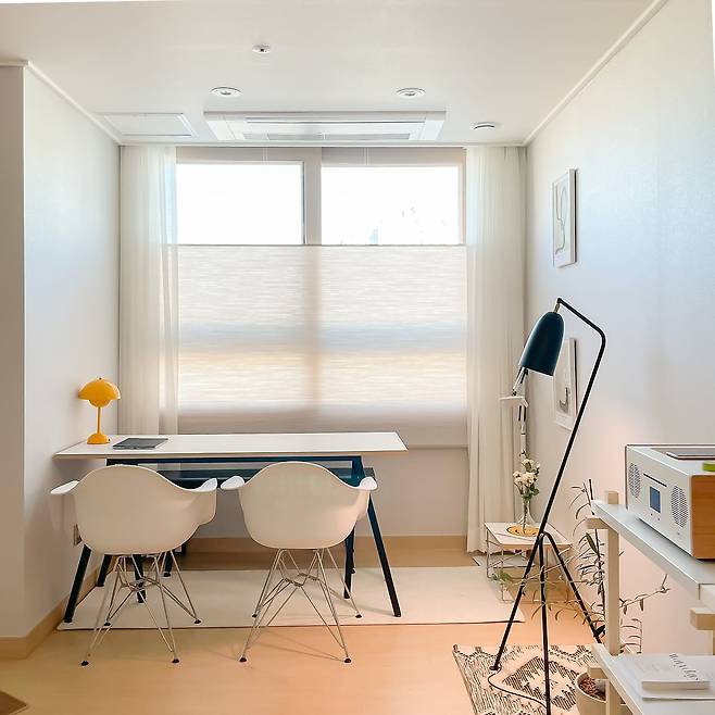 이 집은 19평 정도 되는 서울 근교의 오피스텔이에요. 호수 공원에 반해 근처에서 살 곳을 찾다가 발견했습니다. 테라스도 마음에 들고 언제든 편하게 다시 서울로 이사 갈 수 있는 위치라는 게 가장 마음에 들었어요.