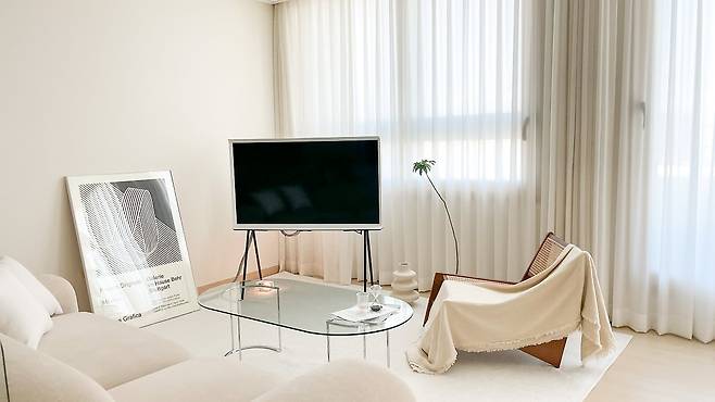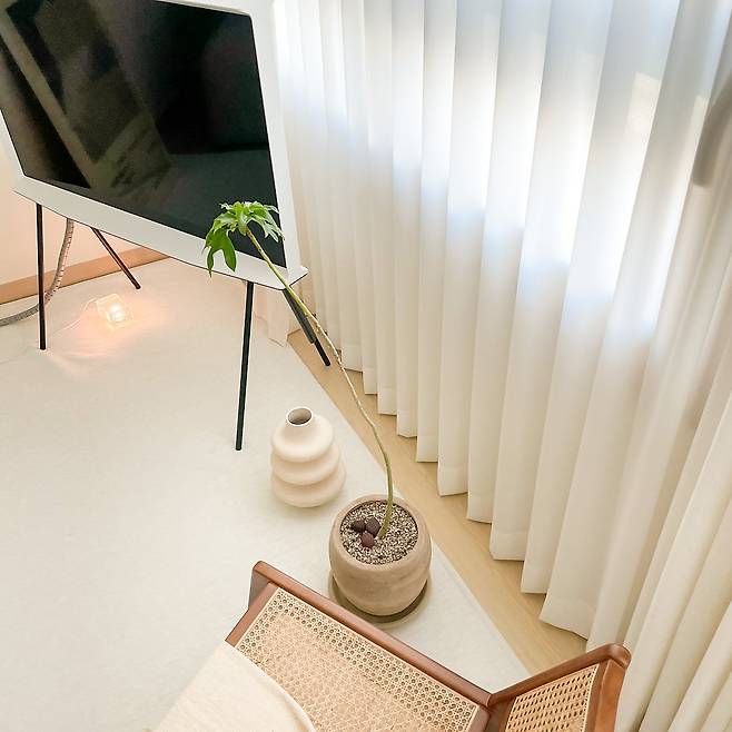 거실은 구조가 특이한 편이에요. 보통은 TV와 소파를 각각의 벽에 두고, 마주 보는 구조를 활용하잖아요. 하지만 저희 집은 그 배치대로라면 소파와 TV 간의 거리가 너무 멀고 동선이 불편해질게 확실했습니다. 그래서 TV를 창가 쪽에 두고 소파를 거실의 가운데에 놓는 구조를 선택했습니다.