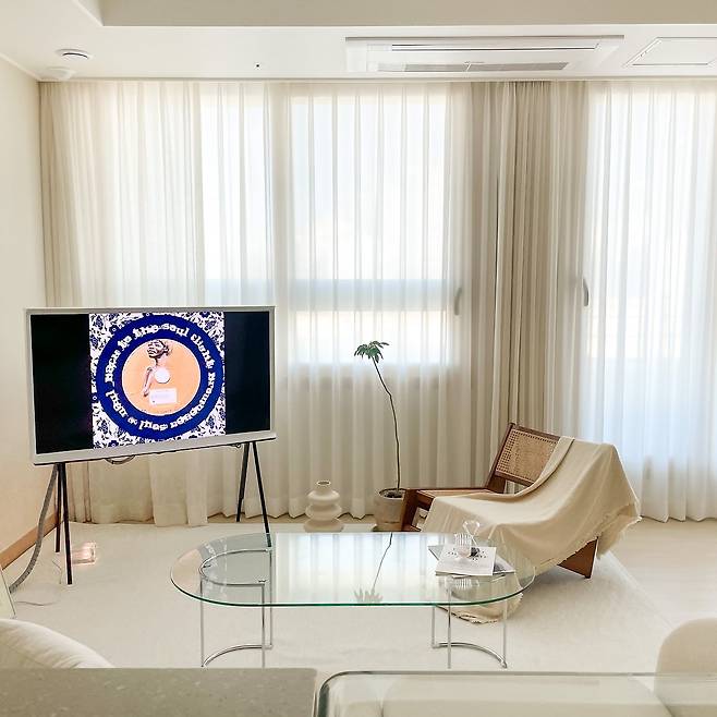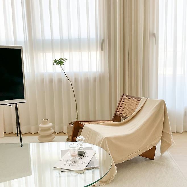 소파 테이블은 소파의 느낌과 이어지도록 타원형으로 골랐습니다. 유리라서 지문이나 얼룩이 잘 보이긴 하지만 변색 걱정이 없습니다. 각자 장단점이 있는 것 같아요. 그리고 사진 속에 보이는 우드 톤 의자는 피에르 잔느레 체어입니다. 허전한 공간에 존재감이 확실한 체어를 하나 두고 싶었는데 너무 잘 어울려서 제게 칭찬을 해주었습니다.