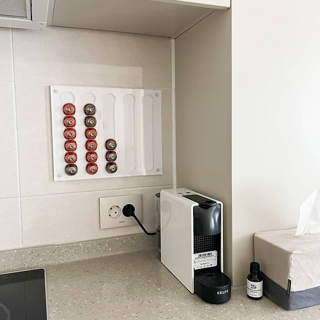 주방은 최대한 무언가를 올려놓지 않는 게 목표였어서, 미니멀한 느낌이 가득합니다. 다만 커피 머신 정도만 바깥으로 꺼내두었는데요. 집들이 오는 지인들마다 꼭 관심을 가지는 게 바로 커피 캡슐 거치대입니다. 타일 벽에 고정도 잘 되고, 귀엽게 캡슐을 진열할 수 있어 아주 잘 산 아이템 중 하나예요. 총 30개를 꽂을 수 있는데 일주일에 한 번 정도 캡슐을 주문해 채워주고 있습니다. 해외 직구로 구매했어요.