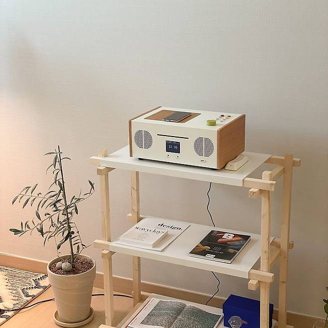 서재의 선반은 각목과 상판을 제작하여, DIY로 완성한 제품입니다. 헤이라는 브랜드의 우드 선반을 모티브로 했는데, 수평을 맞추기가 조금 어렵더라고요. 하지만 완성하고 나서는 아주 만족하고 있습니다. 맨 위에 올려둔 건 집 분위기와 잘 어울리고 소리도 좋은 블루투스 스피커입니다. 그 아래에는 좋아하는 B 매거진과 요시고 포토북을 두었습니다.