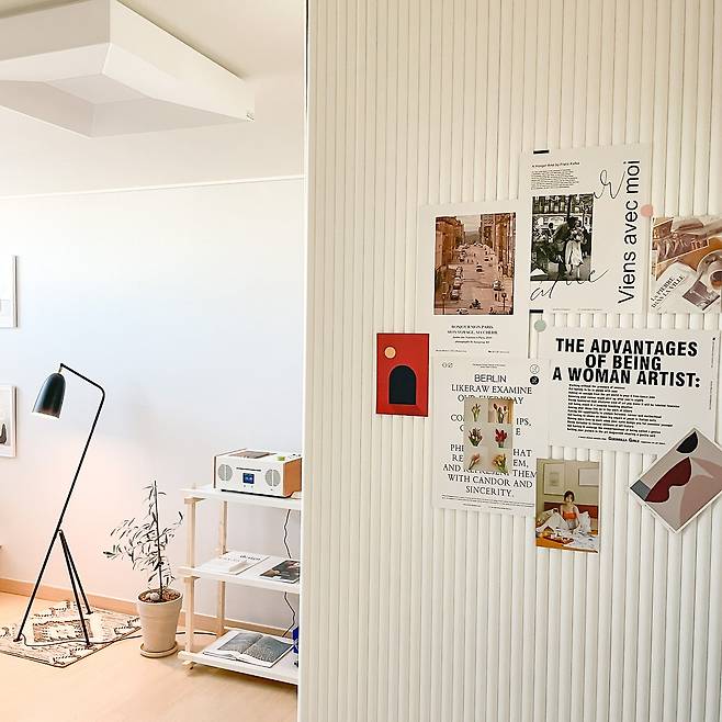 서재는 가구와 소품의 조화도 좋지만, 작은 디테일을 더해 더욱 완벽해진 공간입니다. 문을 열자마자 보이는 청소기와 스타일러가 너무 안 예뻐서 유리장을 구매해 가벽으로 만들어 주었거든요. 그리고 유리장 뒷면에 템바보드와 그림을 붙여주었더니, 입구부터 이렇게 감성적인 곳이 되었습니다.