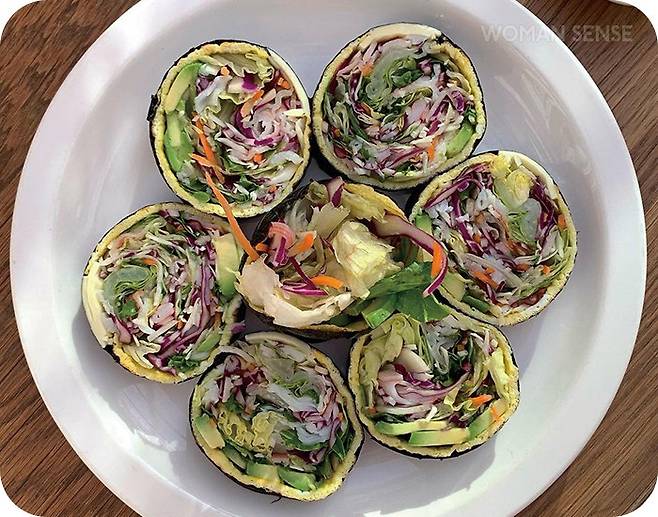 채소 믹스, 달걀·게맛살 2개씩, 아보카도 1/2개, 슬라이스치즈, 무쌈 3장, 김 2장