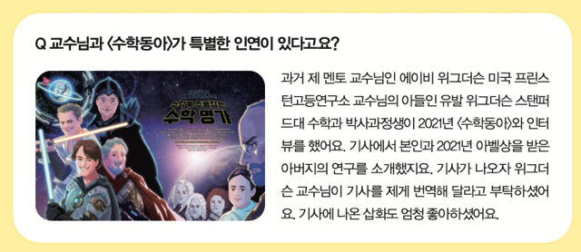 “저는 거창한 목표를 갖고 살지 않아요. 가족과 나들이 가기, 영화 보기처럼 매일 순간순간을 행복하게 살려고 노력하죠. 수학도 문제를 푸는 모든 순간이 행복해서 선택했어요. 물론 임곗값을 정확히 알아내는 법을 찾고 싶긴 합니다.”
