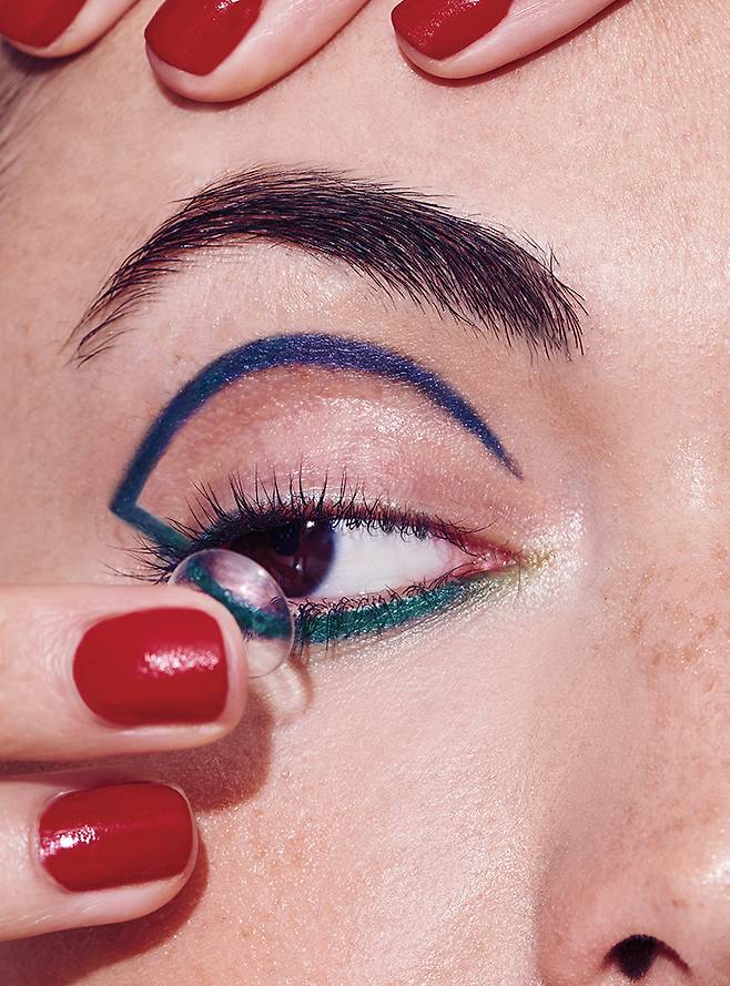 색상이 화려한 컬러 렌즈일수록 자글자글한 펄이 가득하거나, 진한 컬러의 섀도가 어울릴 거라는 생각은 NO! 자칫하면 눈매가 답답하고 촌스러워 보일 수 있다. 이럴 땐 선에 집중하자. 아이라인을 강조하거나, 속눈썹을 바짝 올리거나! 눈 바깥쪽으로 확장돼 보이는 효과 덕분에 한결 시원한 느낌이 들 것. 펄을 더하고 싶다면 입자가 큰 글리터를 점 찍듯 올려보자.
