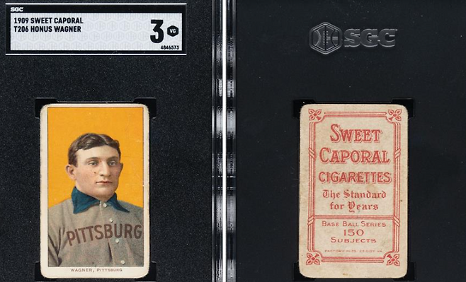 카드 보존 상태는 그리 좋지 않지만 5억원대에 팔린 카드도 있습니다. 바로 T206 세트 중 하나인 호너스 와그너(Honus Wagner) 카드입니다. 2022년 2월 SPC 옥션에 호너스 와그너 카드가 등장했는데요, 이 카드는 온전하지 못한 상태에도 47만5959달러(한화 약 5억7000만원)에 낙찰됐습니다. 카드는 와그너의 얼굴 중 왼쪽 뺨과 턱의 상당 부분, 그리고 몸통의 3분의 2가량이 찢어져 사라진 상태였습니다. 이런 상태에도 비싸게 팔린 이유는 이 카드의 희소성 때문이죠.