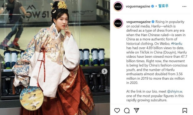 한복을 자신들의 것이라고 주장하는 중국의 계략은 이뿐만이 아닙니다. 미국 패션 전문지 ‘보그(Vogue)’는 한복풍 의상을 ‘한푸(Hanfu)’라고 소개했습니다. 보그는 공식 소셜미디어 계정에 한복풍 의상을 입은 중국 여성 모델의 사진을 올리면서 ‘#Hanfu’라는 해시태그를 달았습니다. 사진 옆 게시글에는 “한족이 통치하던 시대의 의복 양식으로 패션에 관심이 많은 중국 젊은층 사이에서 열풍이 불고 있다”고 소개했죠. 또 “한푸 애호가는 2019년 356만명에서 2020년 600만명 이상으로 증가했다. 웨이보에서 한푸의 검색량은 48억9000만회가 넘었고, 틱톡 영상 조회수도 477억회 이상”이라고 설명했습니다.