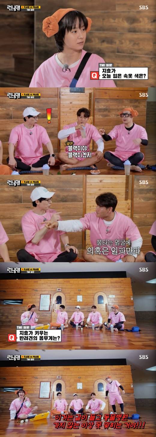 [마이데일리 = 임유리 기자] 김종국이 송지효가 입은 속옷 색깔과 반려견의 몸무게를 맞춰 멤버들에게 의심을 샀다.