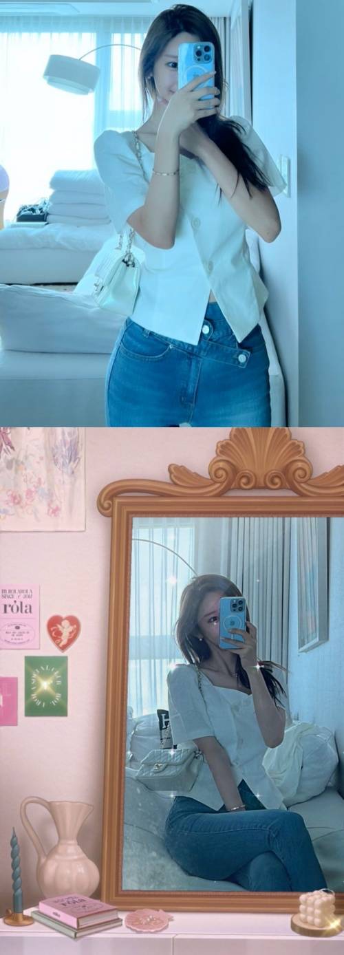야옹이 작가는 허리선이 살짝 보이는 디자인의 블라우스로 한 줌 개미허리를 뽐냈으며 앉아서 촬영한 거울 셀카는 마치 웹툰에서 막 튀어나온 듯한 여신 비주얼을 자랑해 눈길을 끈다.