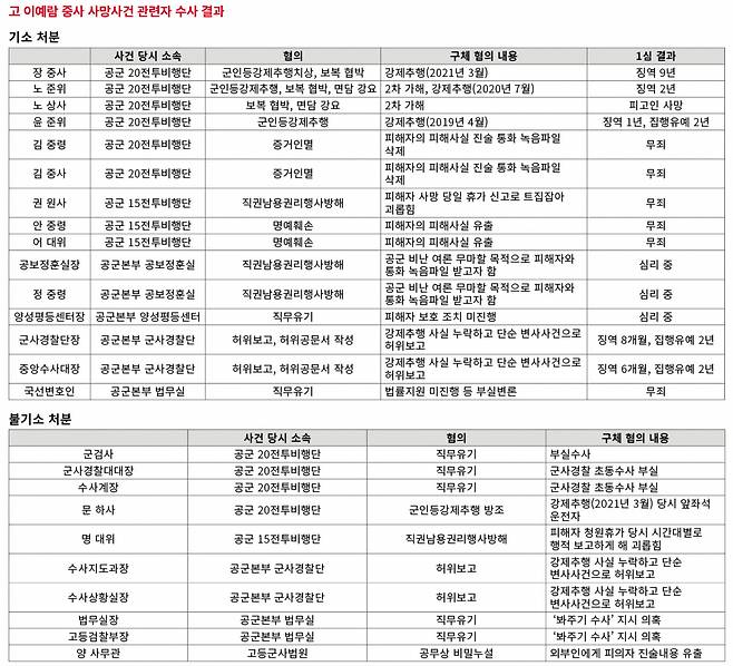 군은 이 중사 사망 이후 5월31일 언론을 통해 사건이 공론화되고 나서야 신속하게 움직였다. 사건은 20비에서 공군본부 검찰부로, 국방부 검찰단으로 이첩됐다. 창군 이래 처음으로 특임 군검사도 임명됐다. 국방부는 공군본부로부터 사건을 이관받아 지난해 6월1일부터 진행한 수사를 지난해 10월7일 종료했다. 수사 결과 사망사건 관계자 중 총 25명이 입건됐다. 그중 15명이 기소, 10명이 불기소처분을 받았다. 초동수사를 맡은 20비 군사경찰과 군검사를 포함해 군검찰을 지휘·감독하는 공군본부 법무실 지휘부는 모두 ‘증거불충분’으로 불기소됐다.
