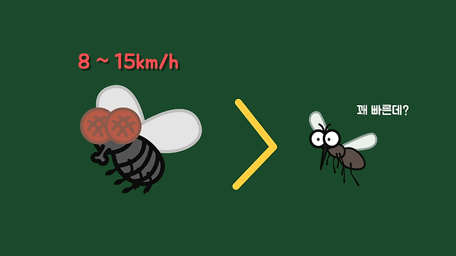 이해하기 쉽게 집에 파리가 들어왔을 때를 떠올려보면 매우 빠른 속도로 날아다니는 것을 관찰할 수 있습니다. 파리의 비행 속도는 시속 8~15km로 모기보다 3~4배 정도 빠른데, 눈으로 좇다 보면 놓치긴 해도 크기가 비교적 크므로 시야에 금방 다시 잡힙니다. 하지만 모기는 크기가 작아서 시야에서 한 번 놓치면 다시 잡기가 어렵습니다.