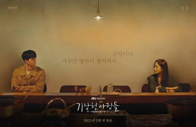 JTBC 새 토일드라마 ‘기상청 사람들: 사내연애 잔혹사 편’(연출 차영훈, 극본 선영, 크리에이터 글Line&강은경, 제작 앤피오엔터테인먼트, JTBC스튜디오)은 열대야보다 뜨겁고 국지성 호우보다 종잡을 수 없는 기상청 사람들의 일과 사랑을 그린 직장 로맨스 드라마다. 지난 1월 5일 겨울잠 자던 연애세포를 깨우는 티저 영상에 이어, 7일 짙은 감성을 머금은 티저 포스터가 공개돼, 박민영과 송강의 로맨스를 기다려왔던 팬들의 내적 환호를 유발한다.