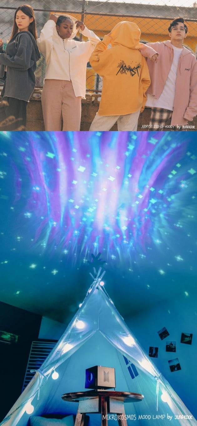 'HYBE MERCH'에 따르면 정국은 'ARMYST' 로고가 박힌 후드 집업 4종과 소우주 무드등을 선보였다.